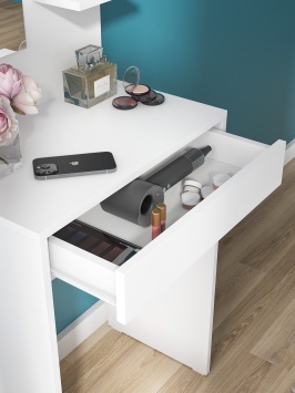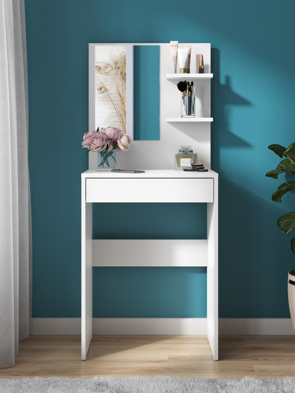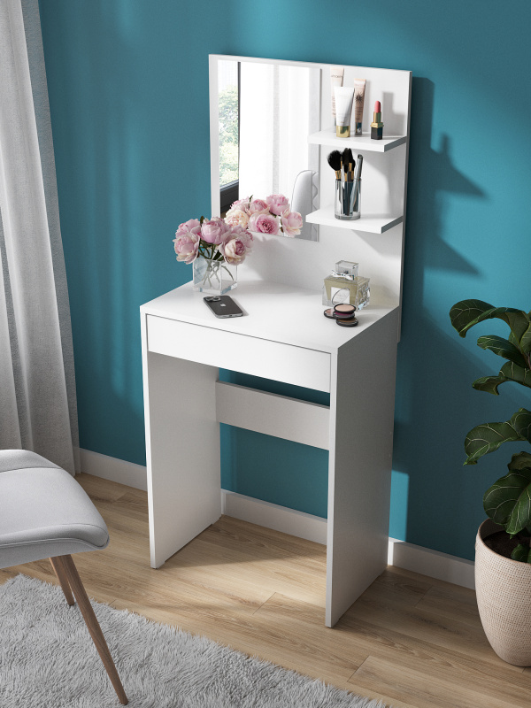 Стол туалетный с зеркалом, полками и ящиком на роликовых направляющих.