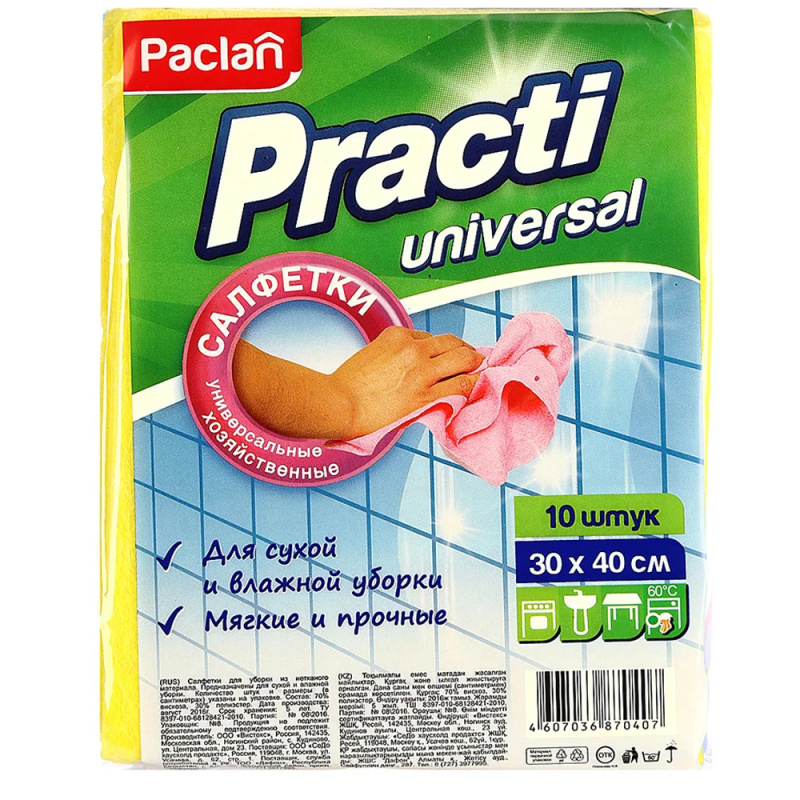 Салфетки для уборки "Practi Universal", изготовленные из нетканого материала, предназначены для влажной и сухой уборки. Мягкие и прочные салфетки прекрасно очищают различные поверхности. Характеристики: Материал: 70% вискоза, 30% полиэстер. Размер салфетки: 30 см х 40 см. Комплектация: 10 шт.