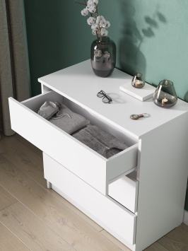 Комод KM 2 в белом текстурном цвете станет универсальным решением для дома. Размеры 704×370×700 (ШхГхВ) мм делают его удобным для небольших помещений. Оснащён вместительными ящиками для хранения белья, одежды или мелочей. Лаконичный дизайн впишется в любой интерьер.