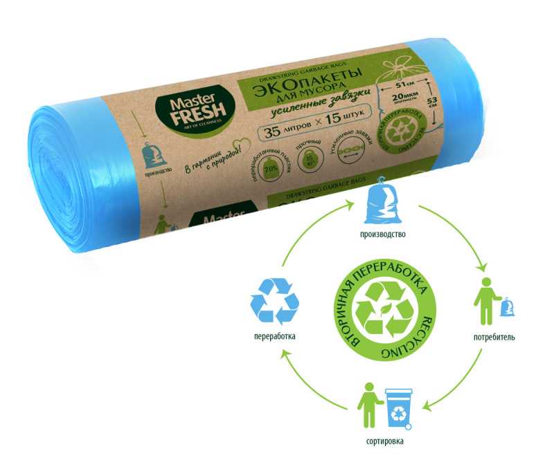Прочные ЭКО пакеты для мусора Master Fresh на 70% производятся из вторичного переработанного сырья. Подлежат последующей переработке. Таким образом, сокращается вред, наносимый окружающей среде. Повышенная плотность ЭКО пакетов Master Fresh позволяет выдерживать нагрузку до 15 кг! Они оснащены усиленными завязками, которые выдерживают вес до 10 кг. Практичные и удобные в применении ЭКО пакеты мягкие на ощупь, из всей линейки пакетов для мусора их выделяет небесно-голубой цвет. Оптимальный размер пакетов идеально подходит для ведра объемом 15л.